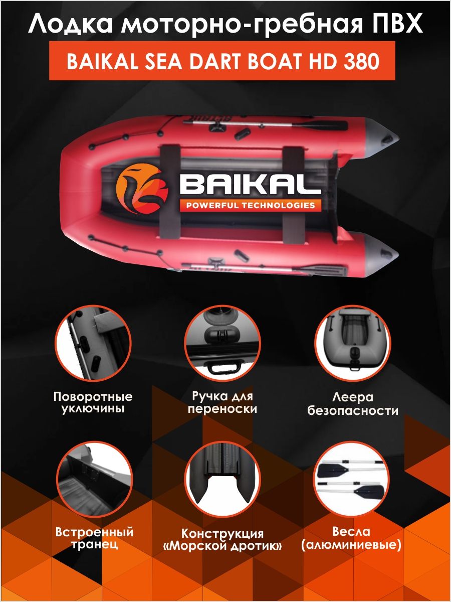 Лодка ПВХ надувная BAIKAL SEA DART BOAT HD 380 – это килевая моторная лодка длиной 3,80 м под мотор до 20 л.с. с надувным дном низкого давления конструкции «Морской дротик».
