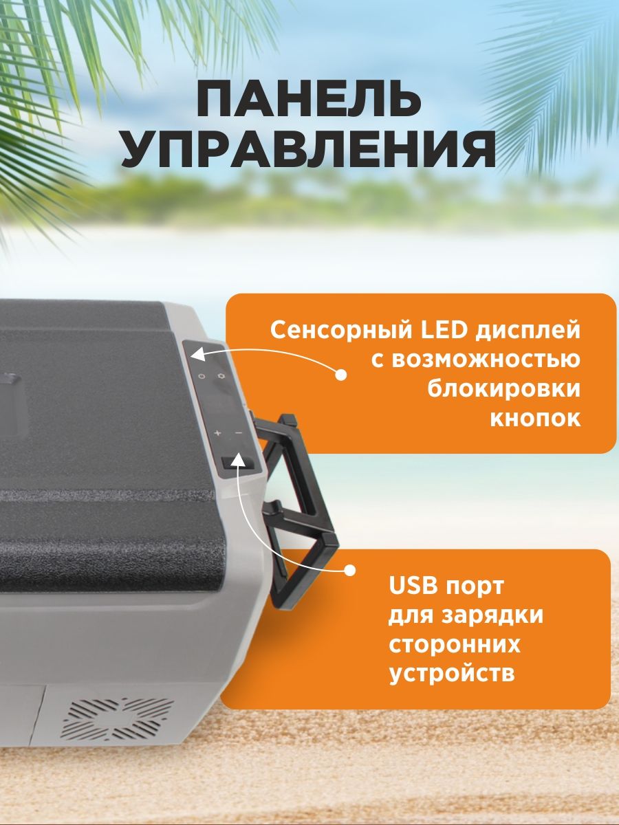 Компрессорный автохолодильник BAIKAL T36 объемом 36 л представляет собой компактное устройство с двумя камерами охлаждения, разделенными съемной перегородкой. Модель снабжена колесиками, телескопической и боковыми ручками для удобства перемещения, герметично закрывающейся крышкой, несложной панелью управления с ярким дисплеем и USB-портом. Корпус выполнен из прочного пластика, надежно защищающего компрессор и внутренние камеры от повреждений при движении по неровному дорожному покрытию и экстренных торможениях. Доступна функция установки в отсеках разных температурных режимов. Удаление перегородки позволяет увеличить объем внутреннего пространства и установить единую температуру.