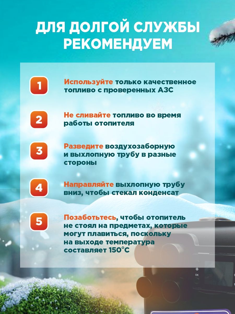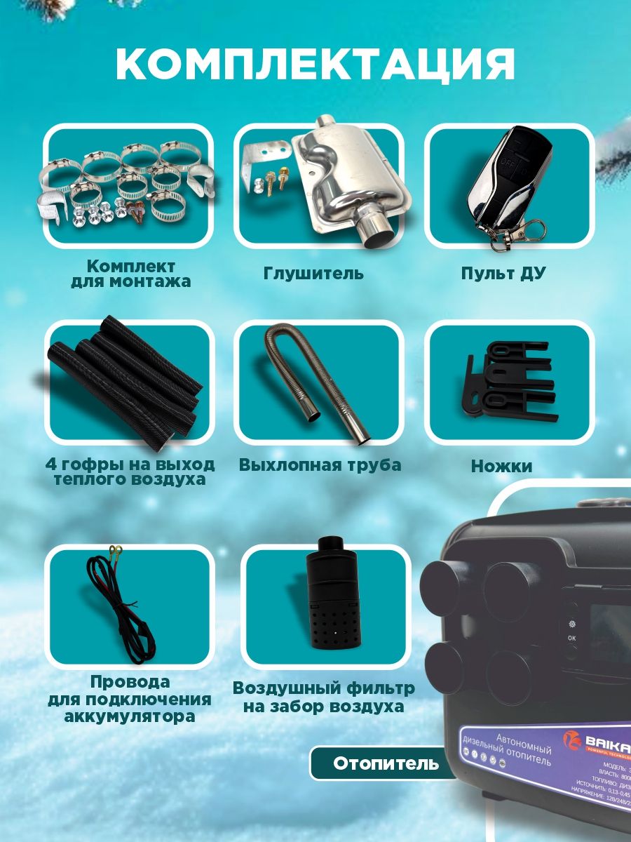 Комплект «под ключ» для быстрого старта: отопитель, пульт ДУ, выхлопная труба с глушителем, 4 гофры для распределения тёплого воздуха, воздушный фильтр, провода для подключения к аккумулятору, комплект для монтажа и подробную инструкцию на русском языке.