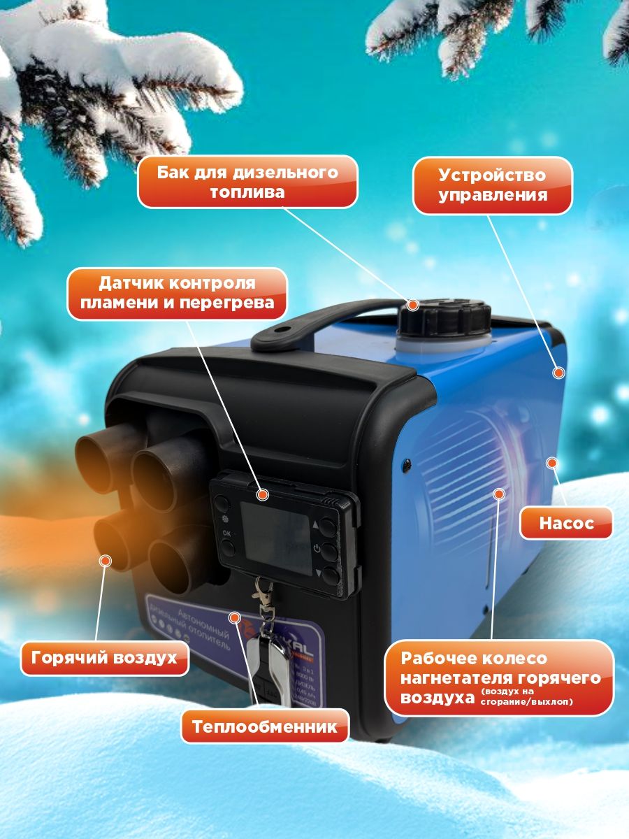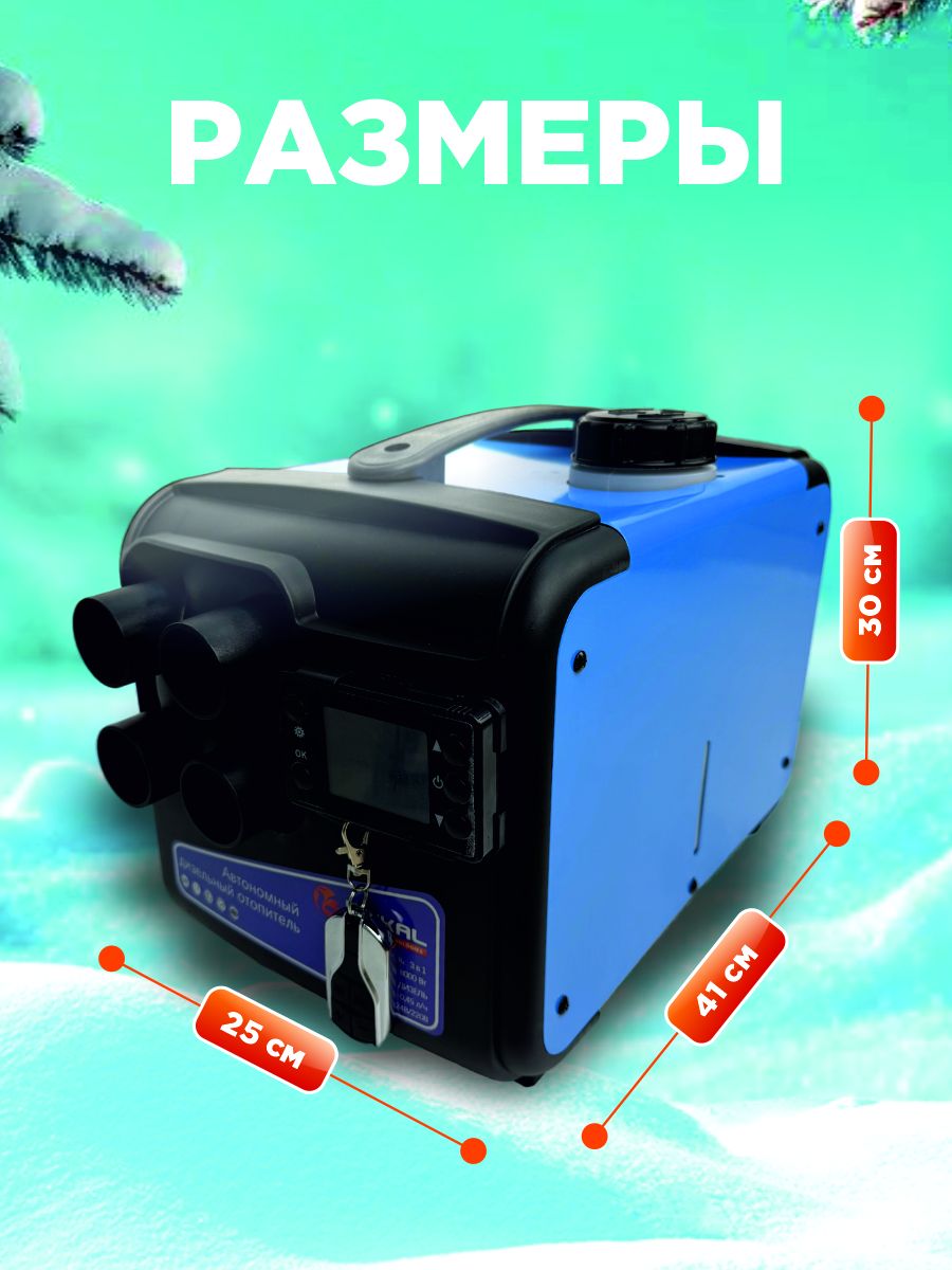 Отопитель оснащён системой цифрового климат-контроля с сенсорным дисплеем и портативным пультом ДУ с радиусом действия до 60 метров. Просто задайте нужную температуру, и устройство будет автоматически её поддерживать, экономя топливо. Функция таймера позволяет запрограммировать включение и выключение.