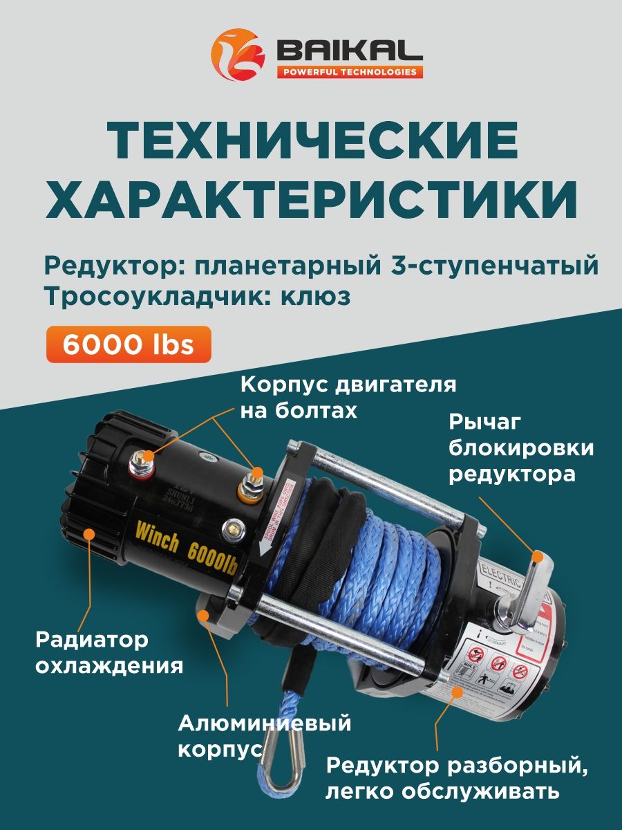 Автомобильная лебедка BAIKAL 6000 lbs 12V с синтетическим тросом (влагозащищенная)