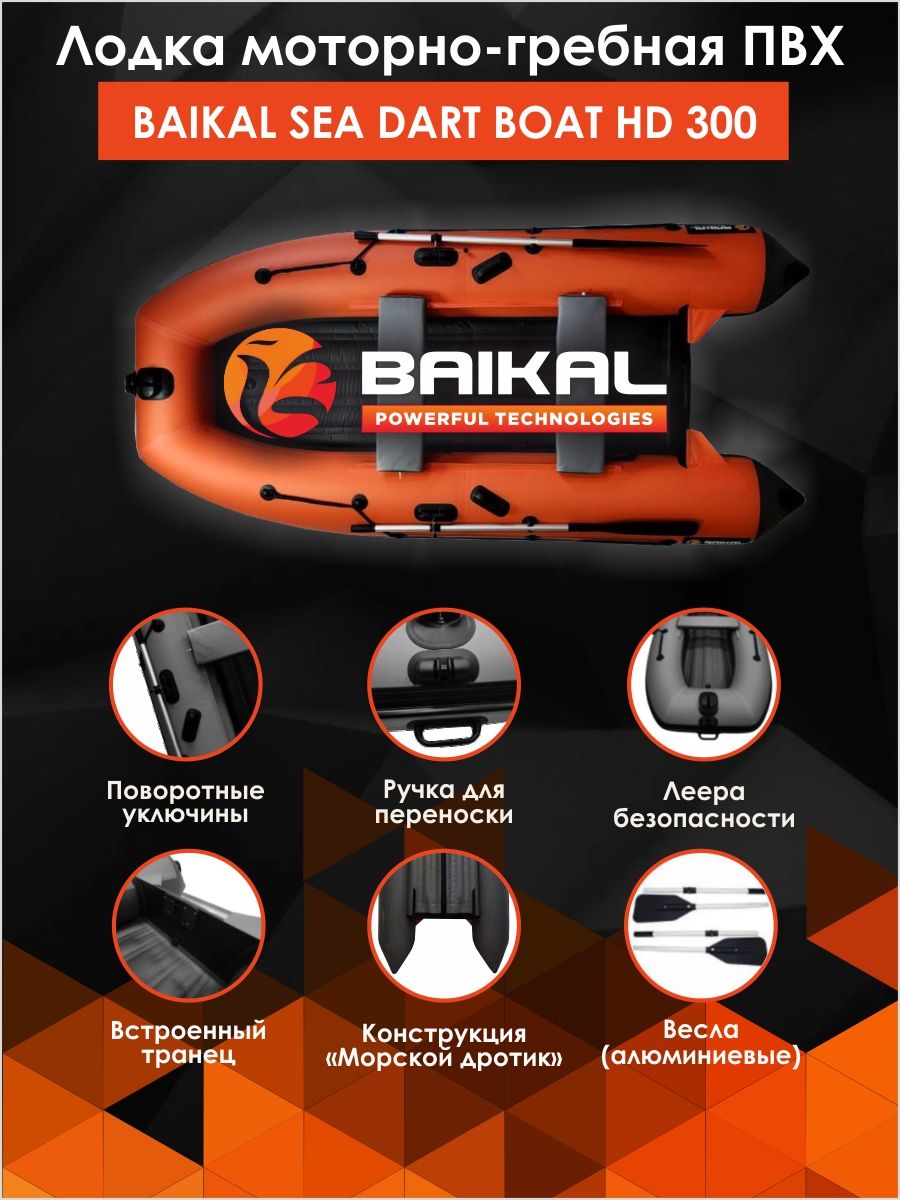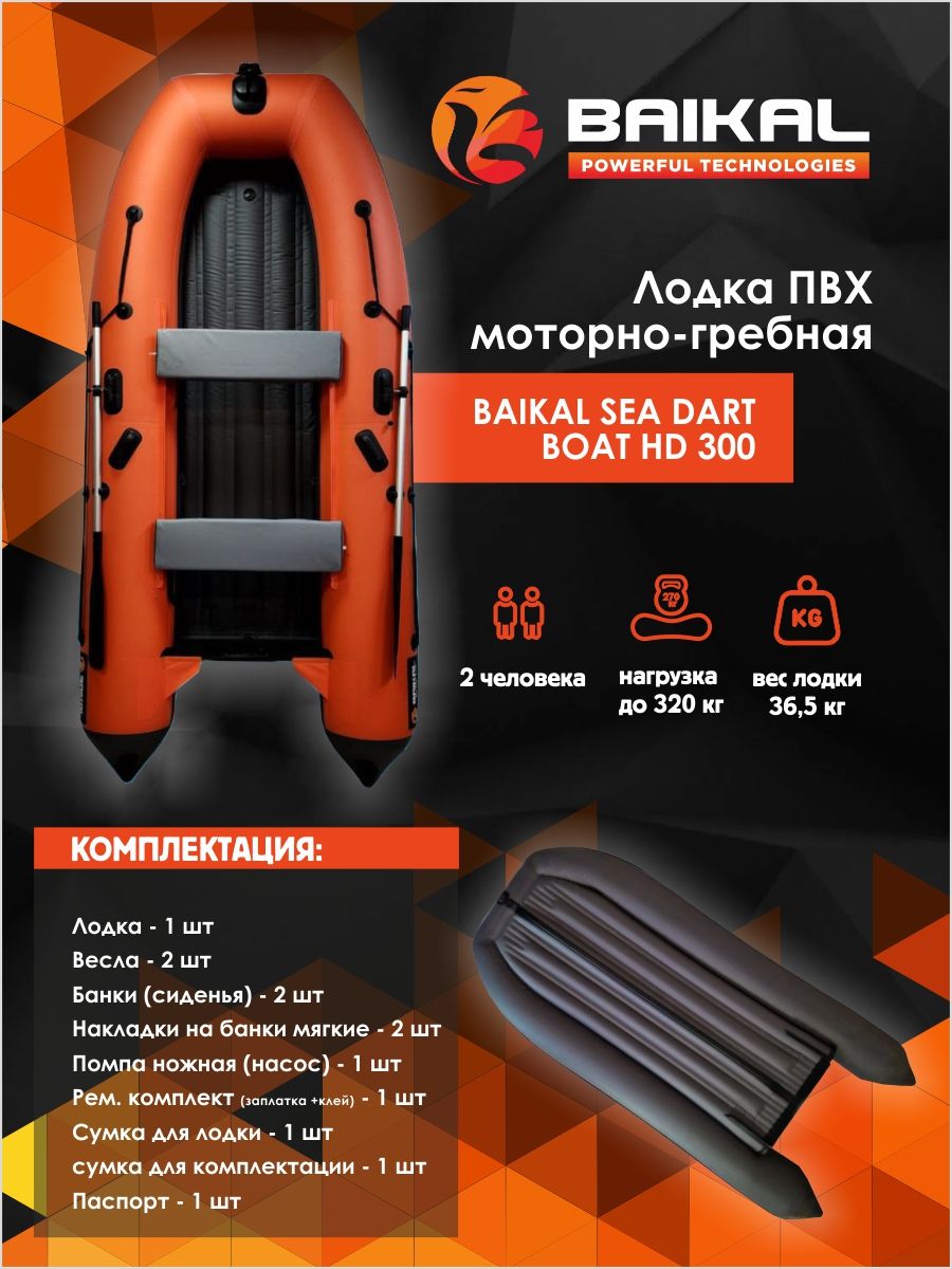 Лодка ПВХ надувная BAIKAL SEA DART BOAT HD 300 – килевая моторная лодка длиной 3,0 м и шириной 1,46 м под мотор до 6 л.с. с надувным дном низкого давления конструкции «Морской дротик».