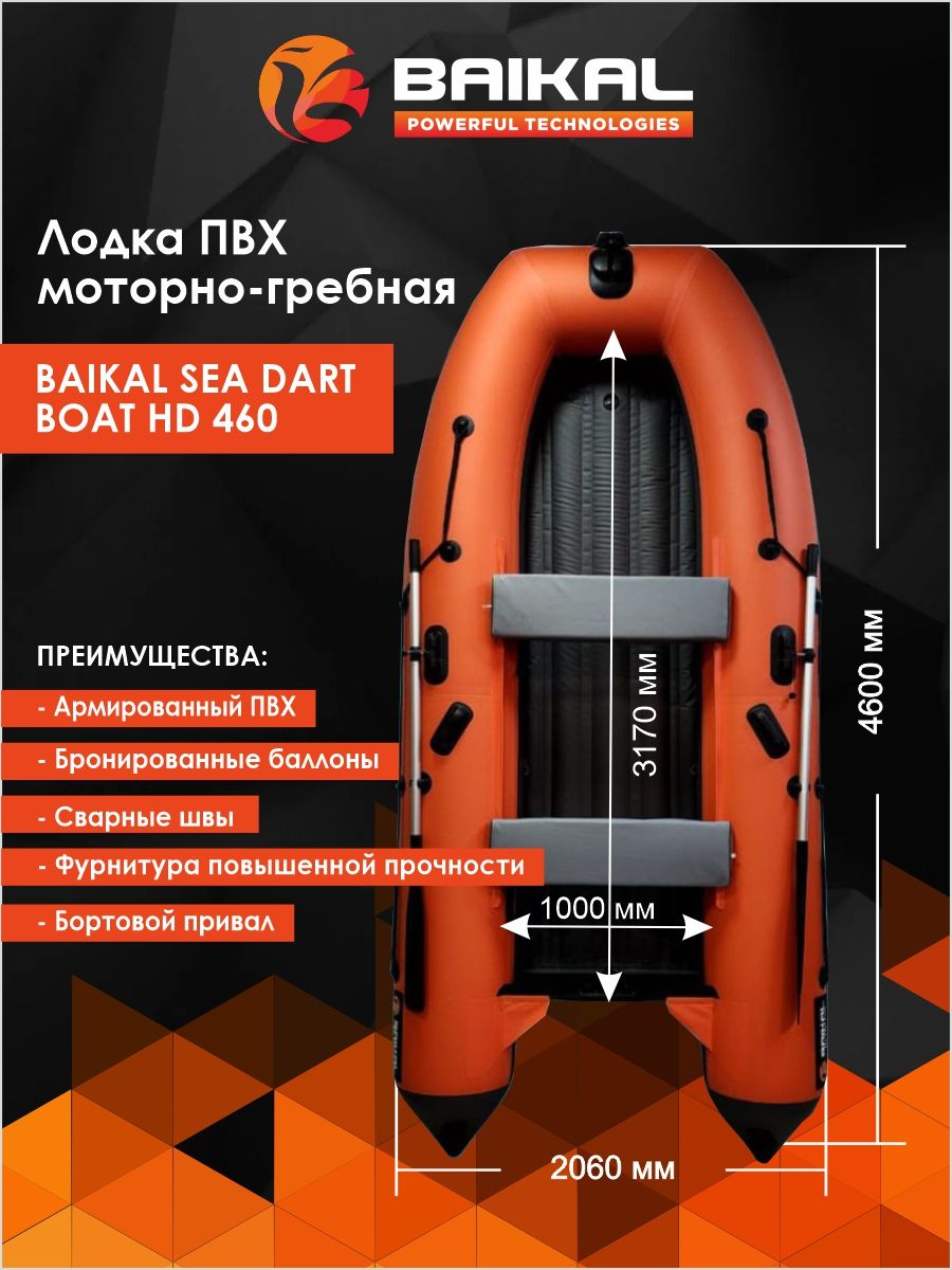 Лодка ПВХ надувная BAIKAL SEA DART BOAT HDS 460 – килевая моторная лодка длиной 4,6 м и шириной 2,06 м под мотор до 30 л.с. с надувным дном низкого давления конструкции «Морской дротик».